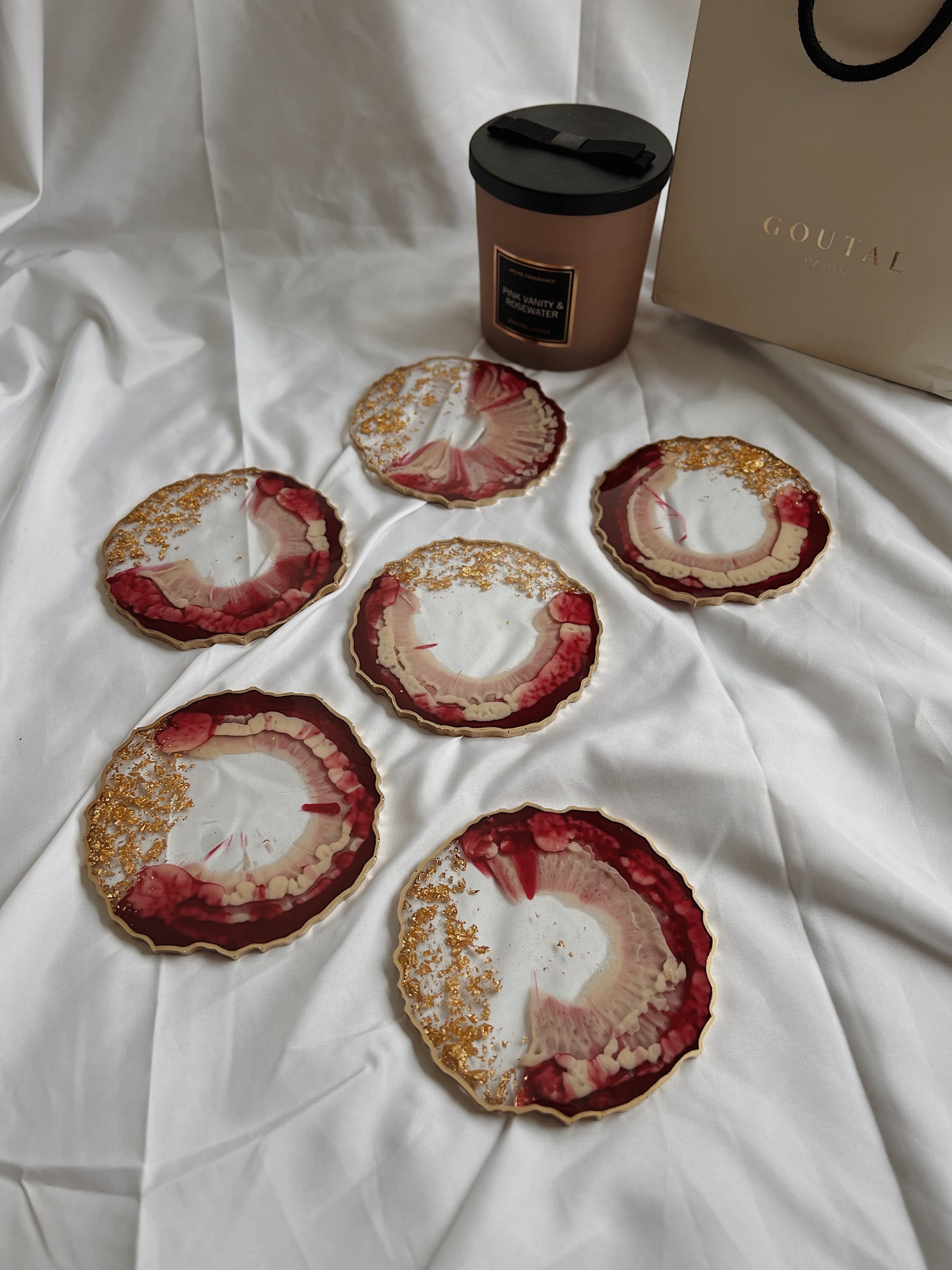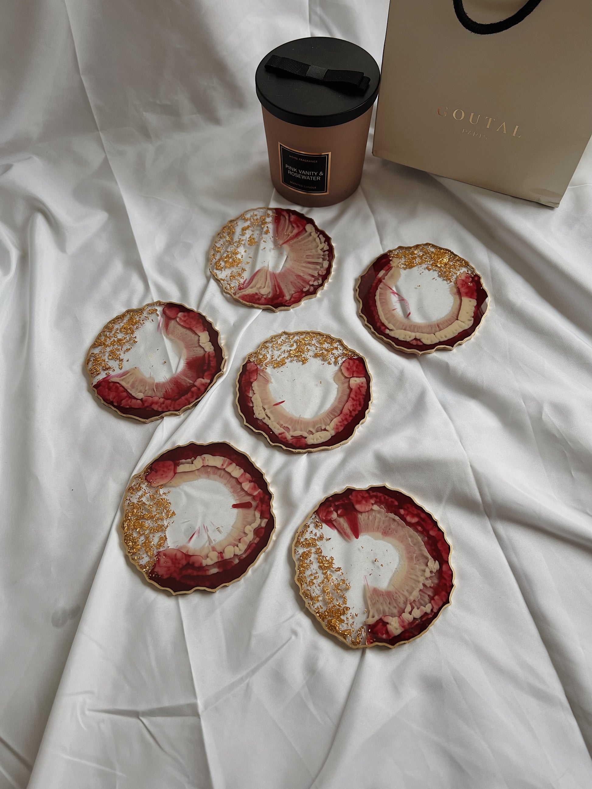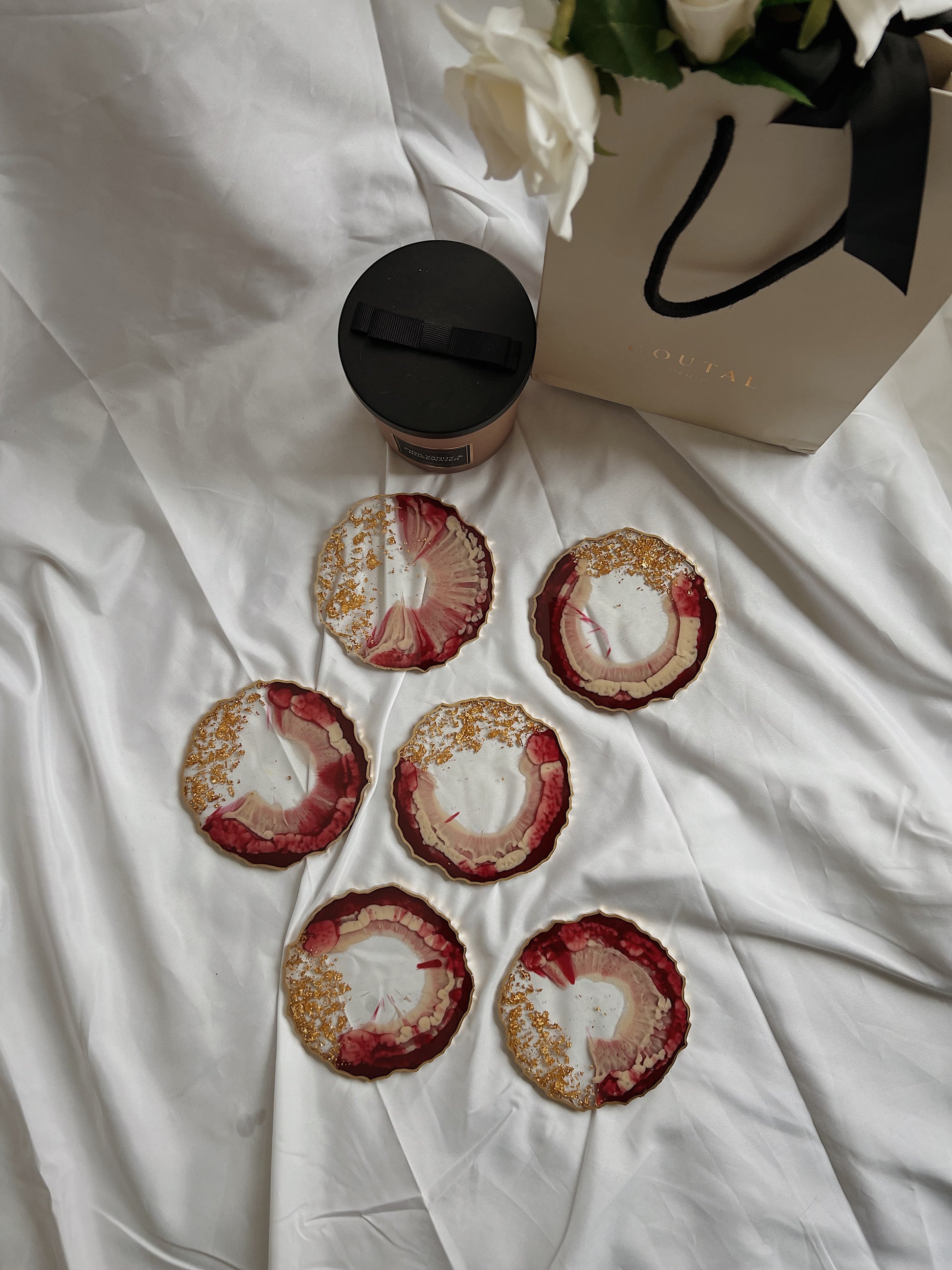 Resin Untersetzer Set (verschiedene Größen) in Agate-Form in rot und beige mit goldenen Akzenten. Bitte beachte, dass alle Gegenstände nach Bestellung gefertigt werden und das Bild nur eine Richtlinie ist.