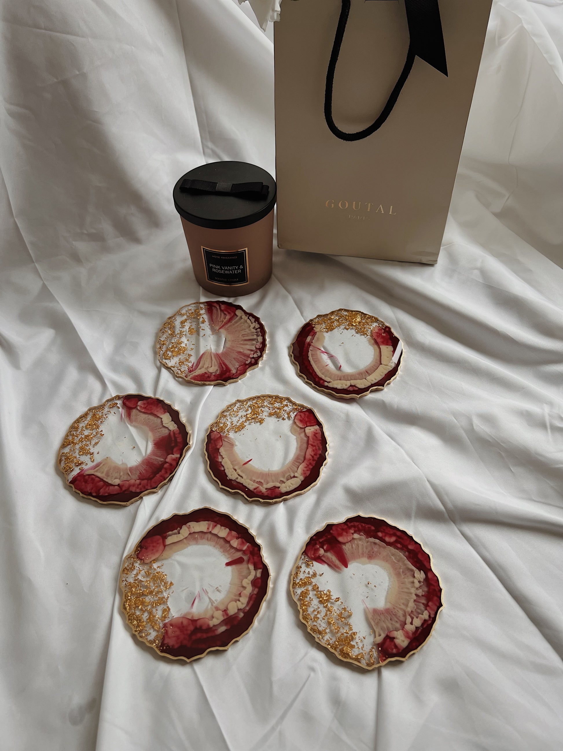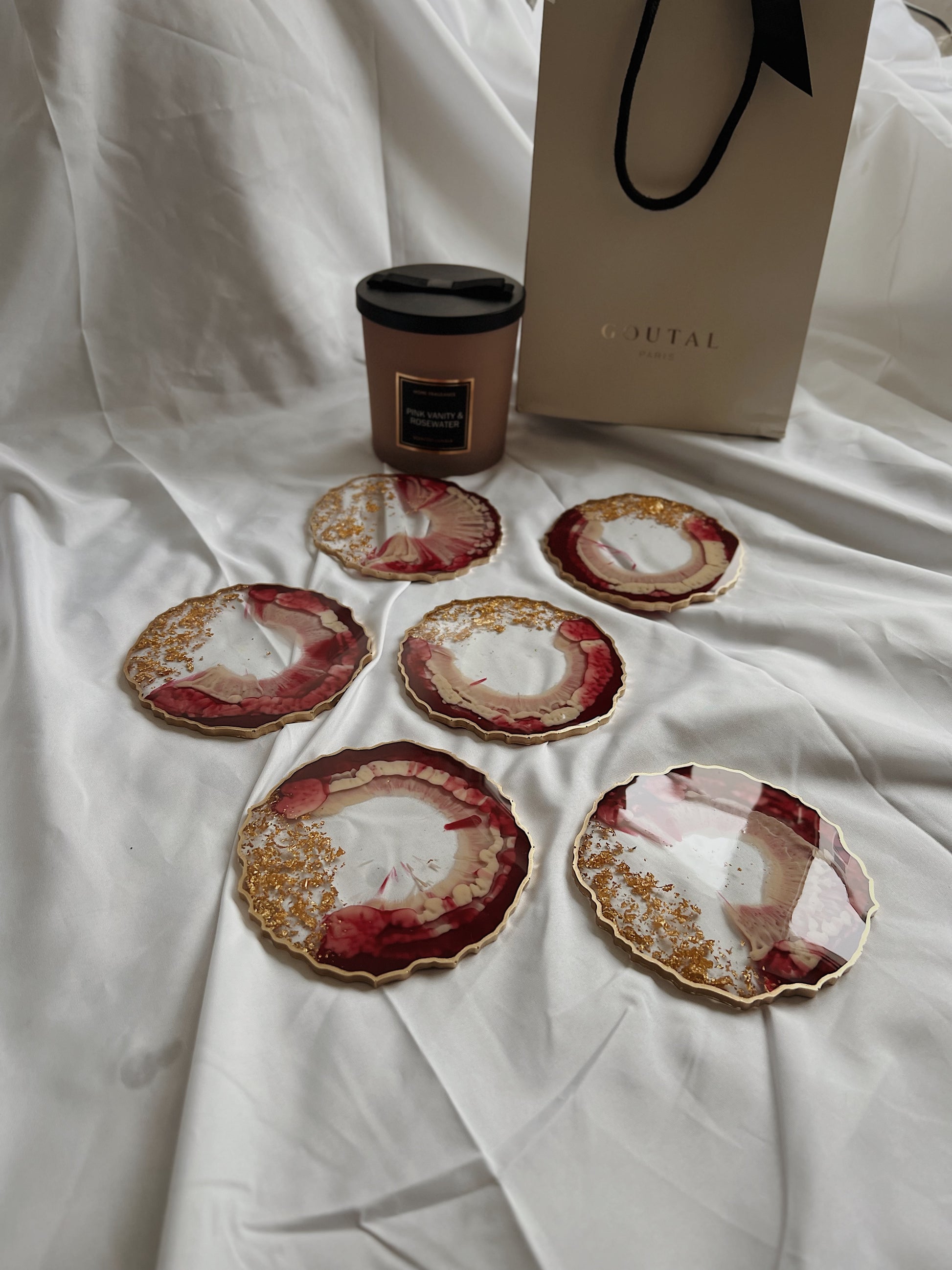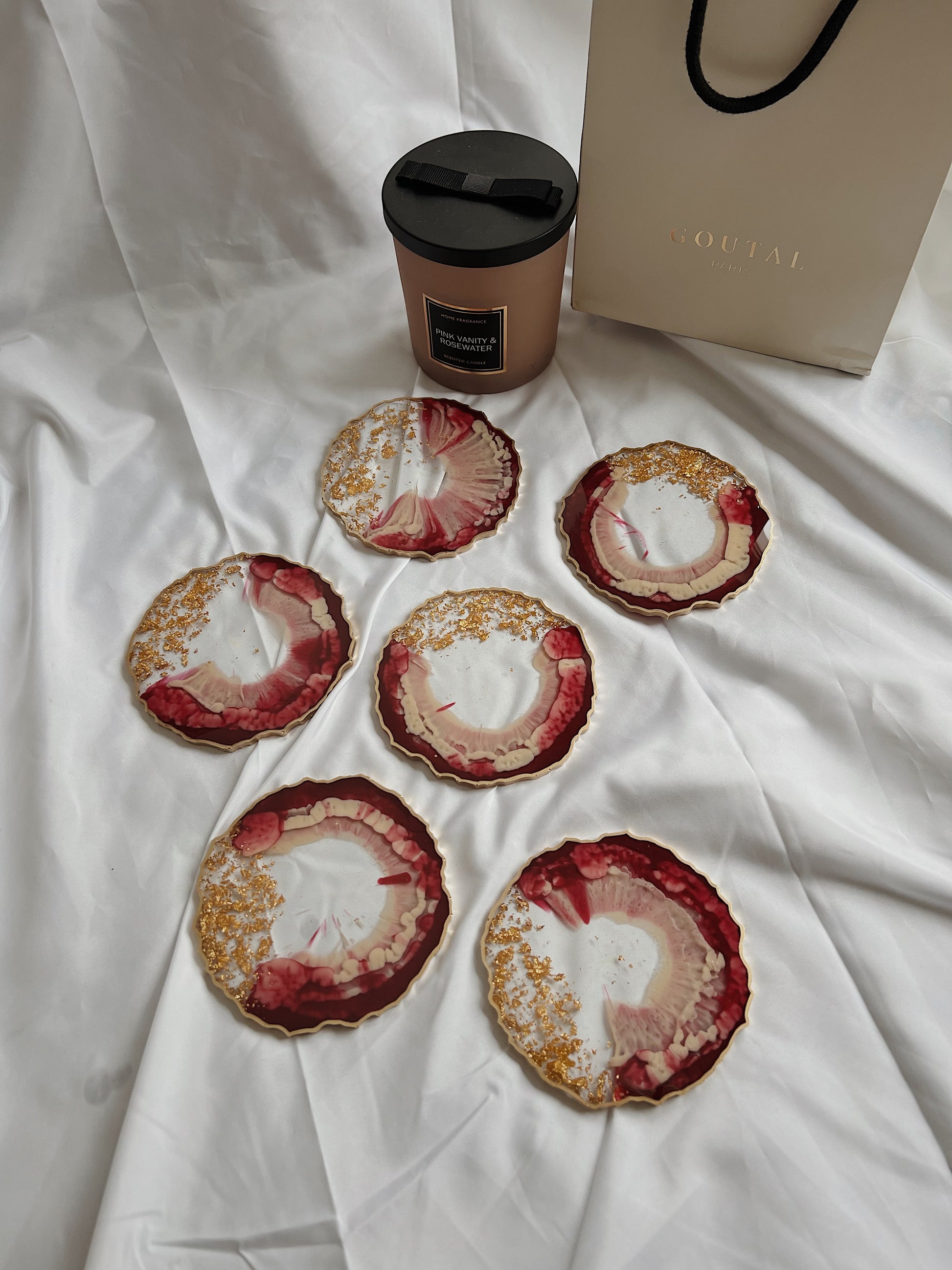 Resin Untersetzer Set (verschiedene Größen) in Agate-Form in rot und beige mit goldenen Akzenten. Bitte beachte, dass alle Gegenstände nach Bestellung gefertigt werden und das Bild nur eine Richtlinie ist.