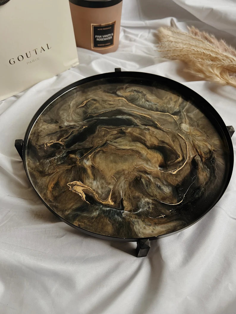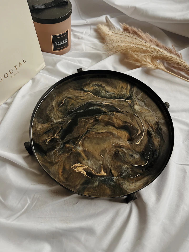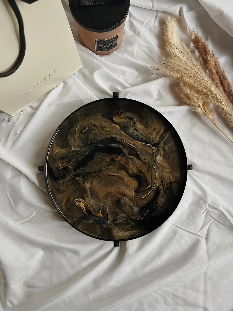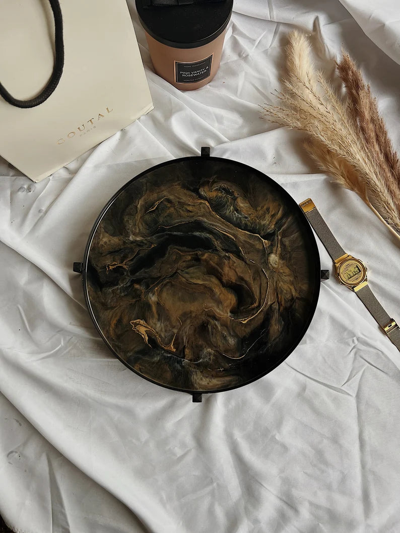 Resin Metall Tablett rund | marmoriert schwarz beige Gold | Schmuckablage Parfumdisplay