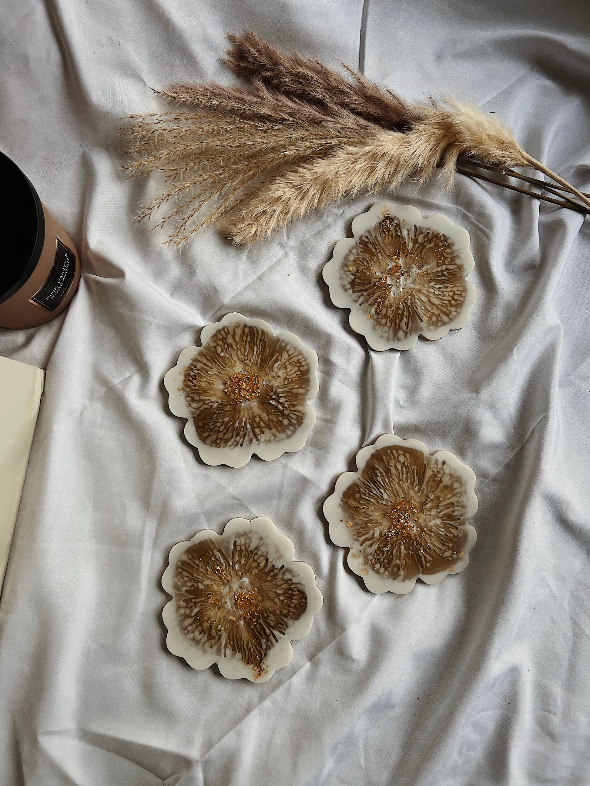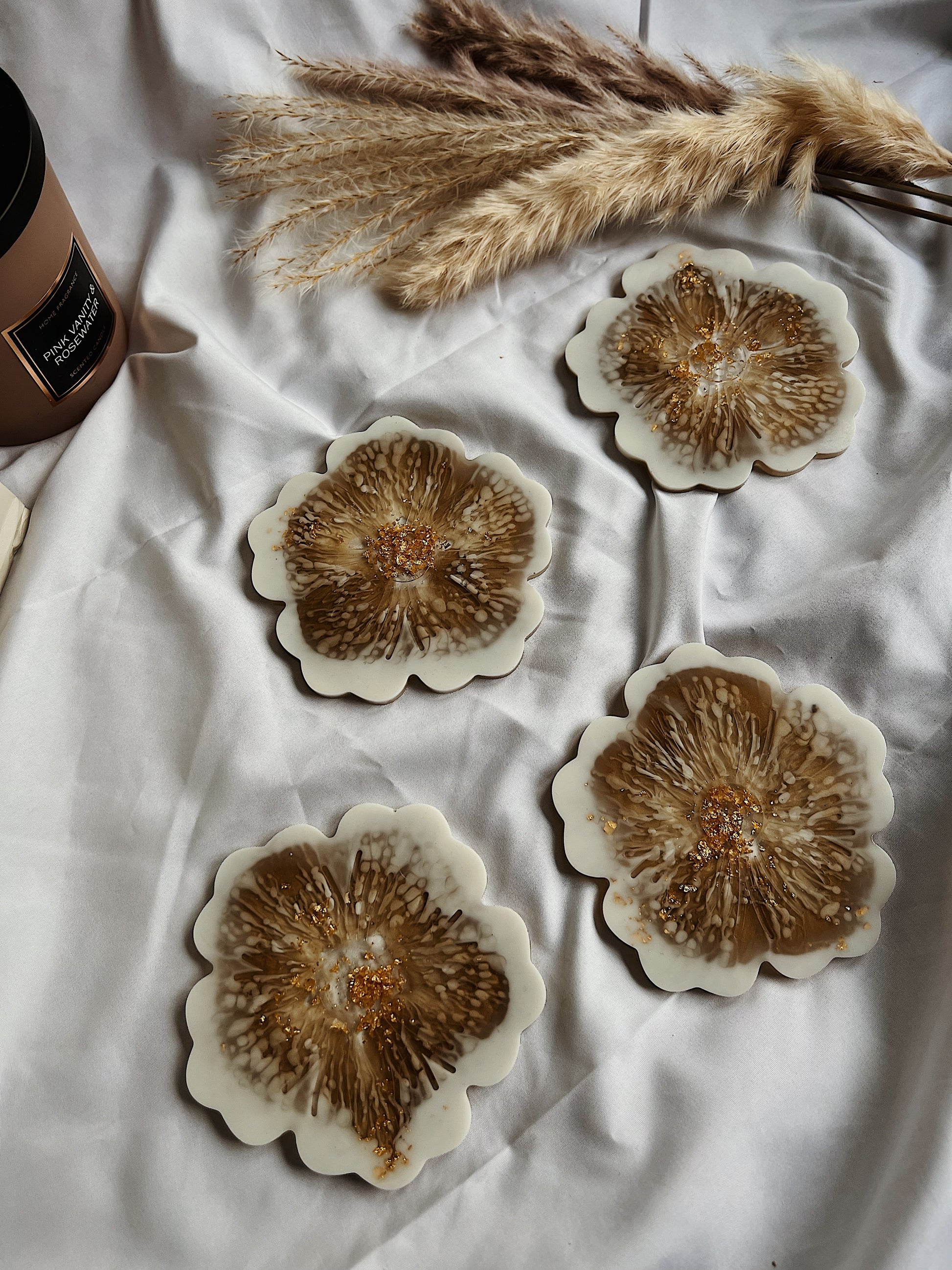 Resin Untersetzer Set Blumenform | weiß beige gold | modern abstrakt