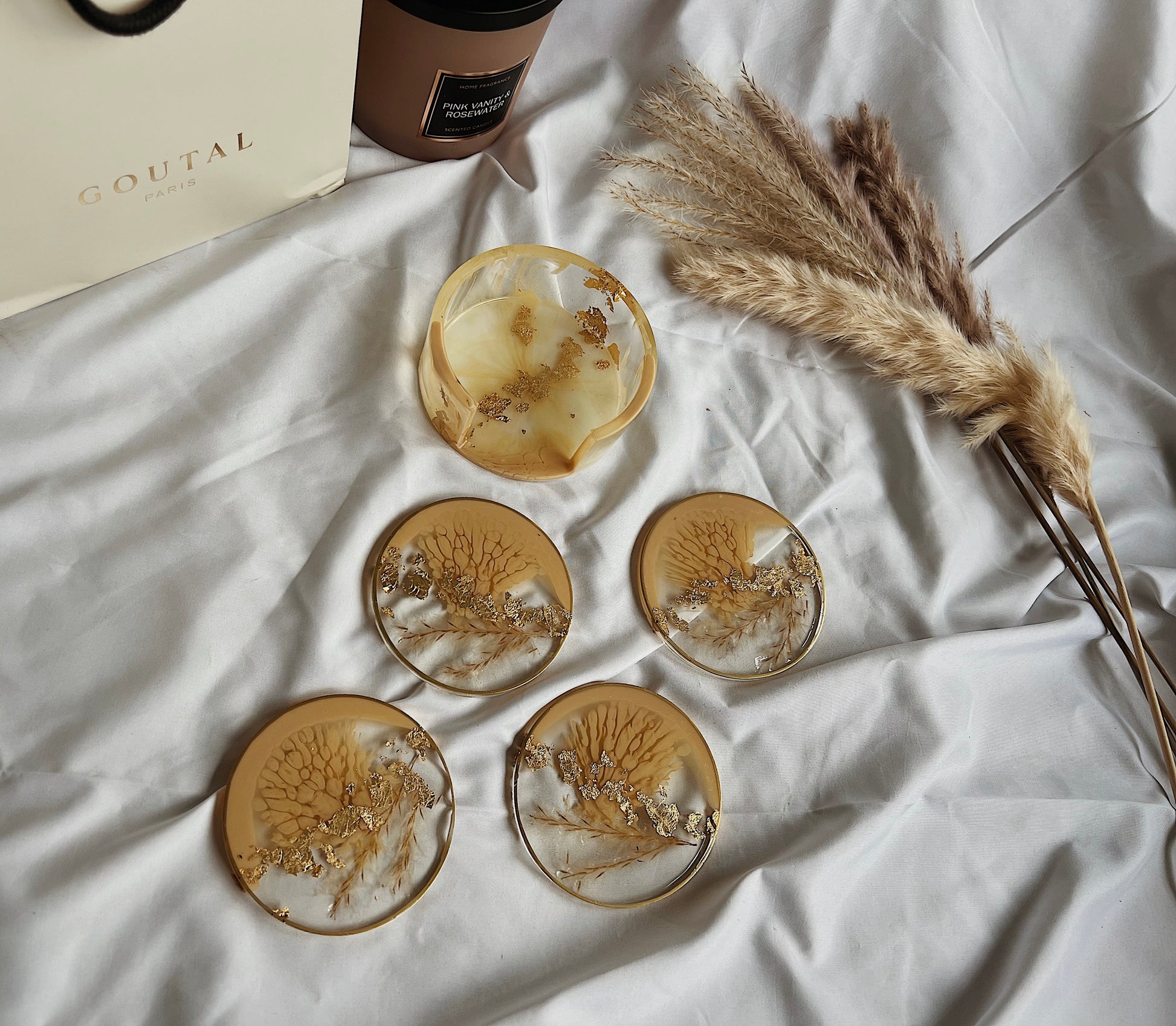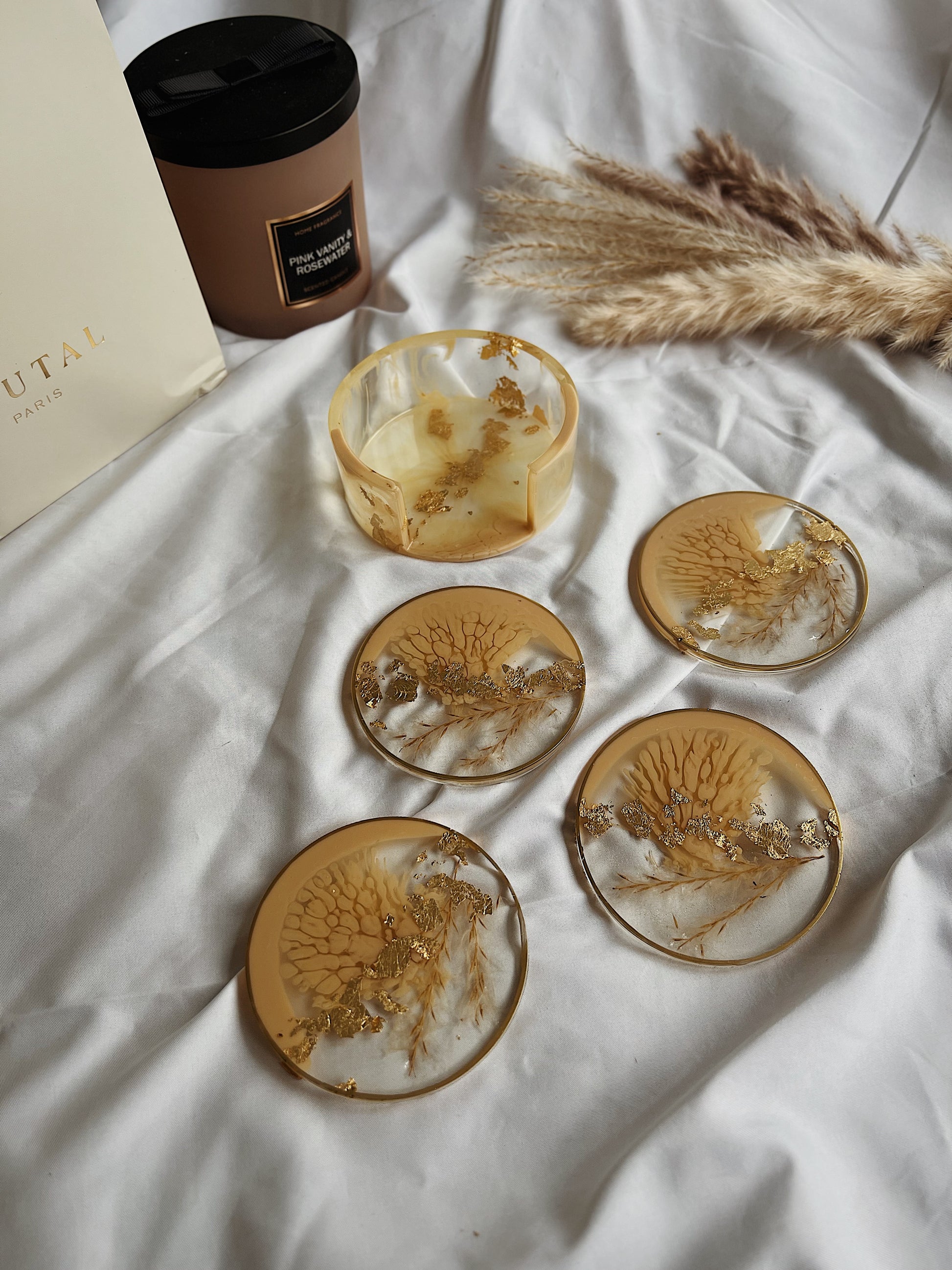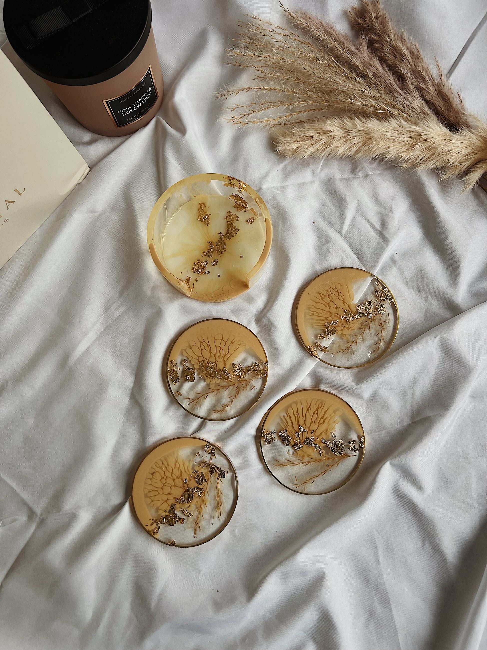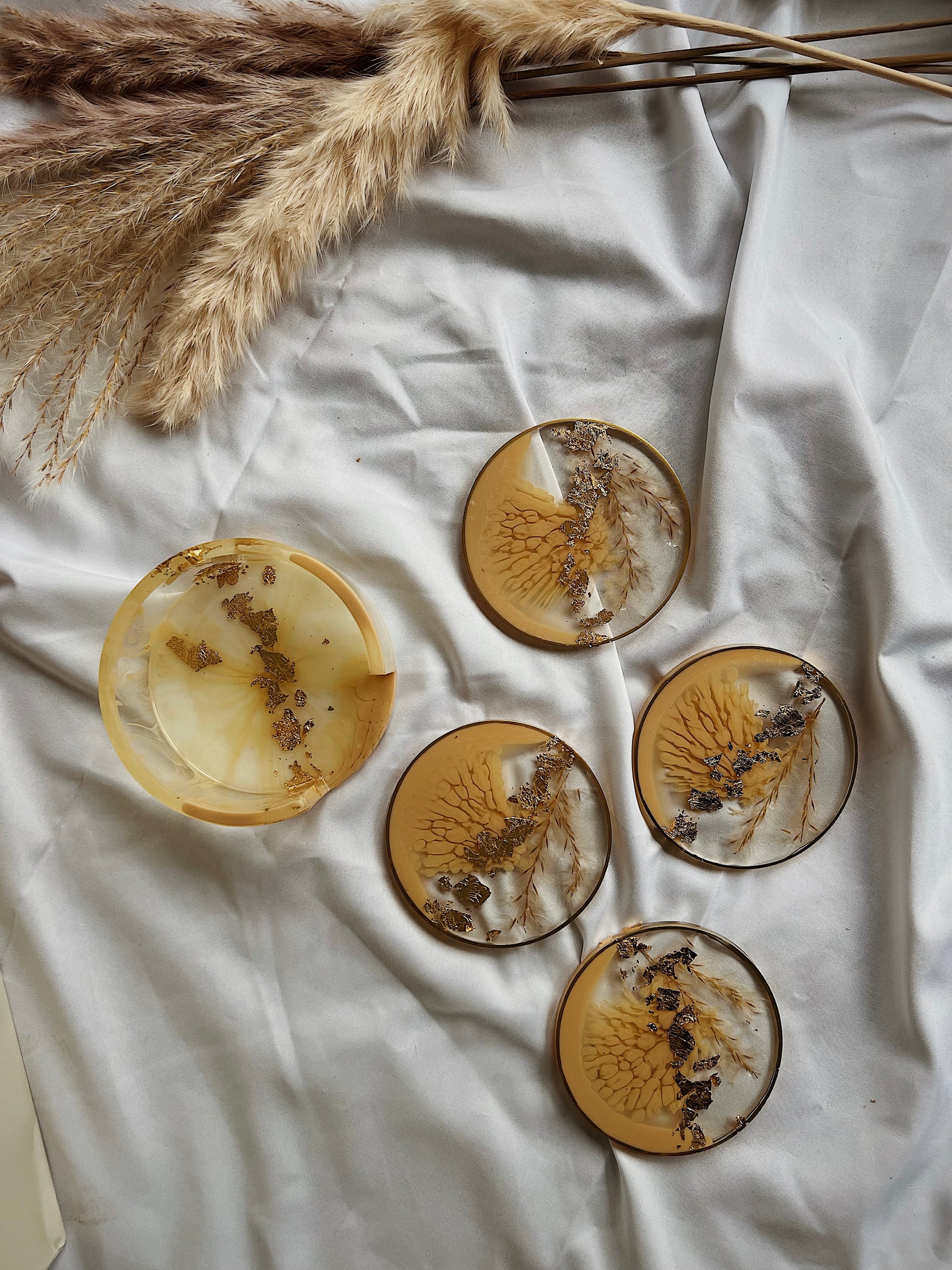 Resin Untersetzer Set rund | beige Gold mit Pampasgras | abstrakt modern BOHO