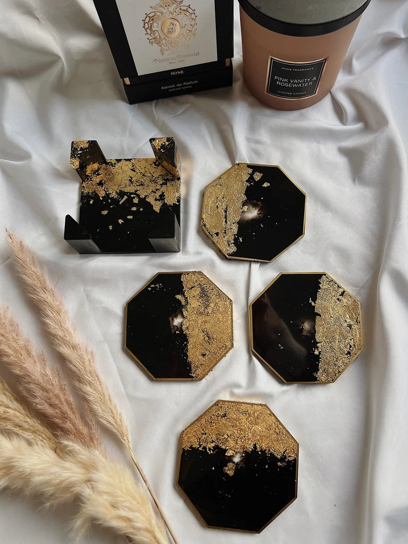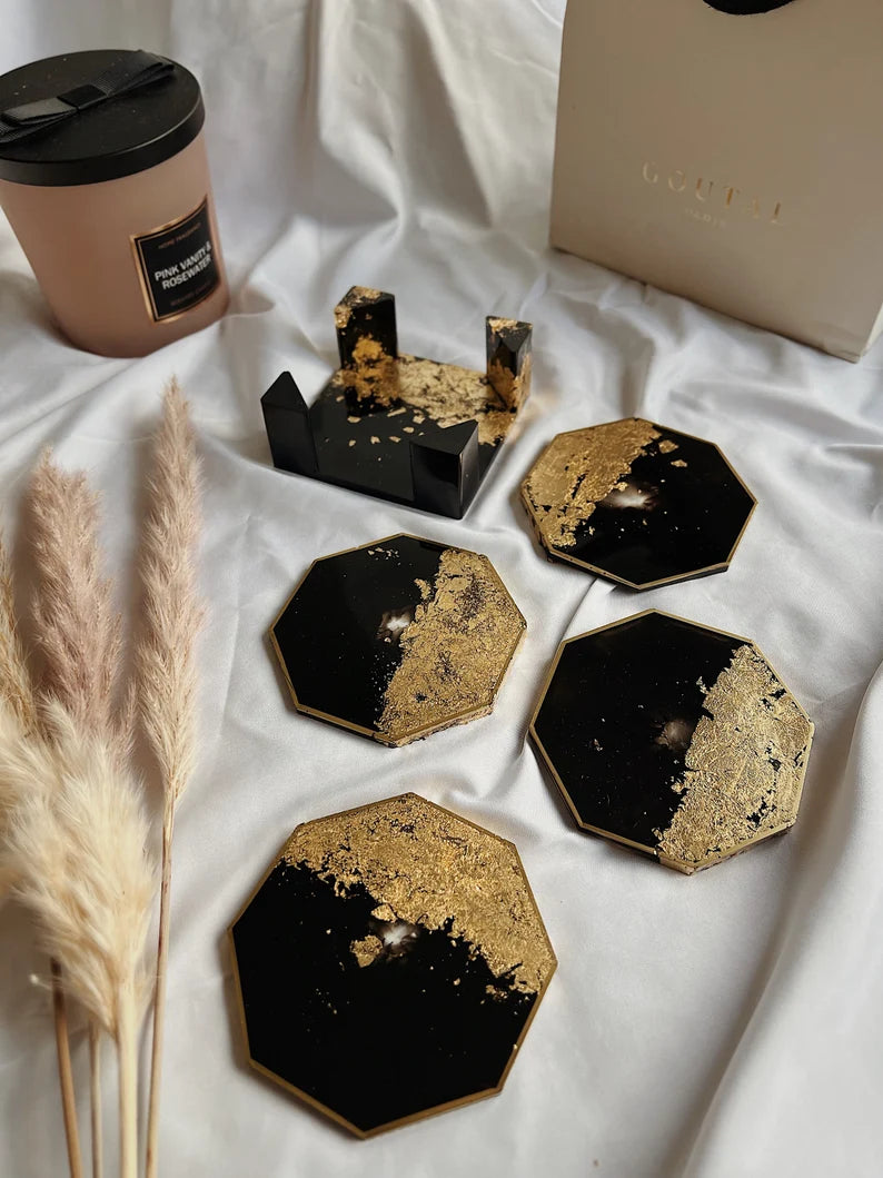 Resin Untersetzer Set wabenform | schwarz Gold | abstrakt modern